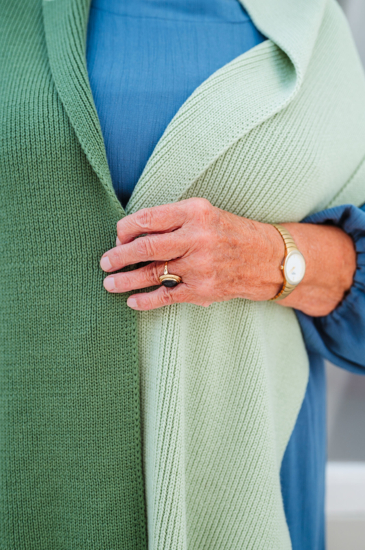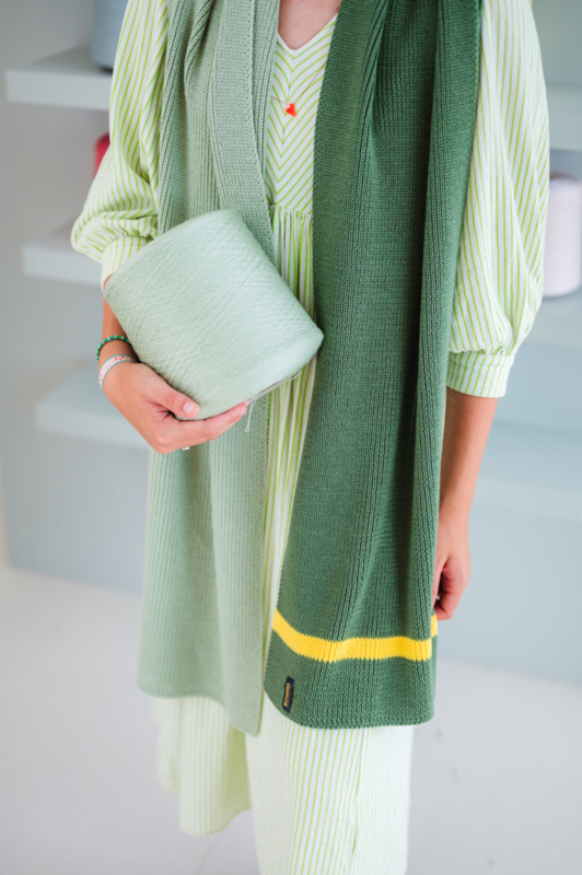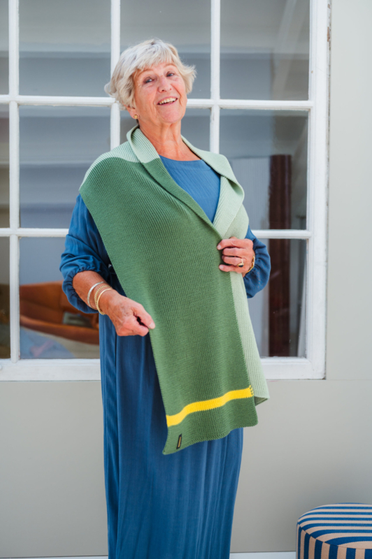 Wat de sjaal bijzonder maakt, zijn de kleurvlakken in zachte groentinten gecombineerd met een subtiele gele streep aan de onderkant. Die gele lijn staat symbool voor vrolijkheid en geeft de sjaal een frisse, eigentijdse uitstraling.