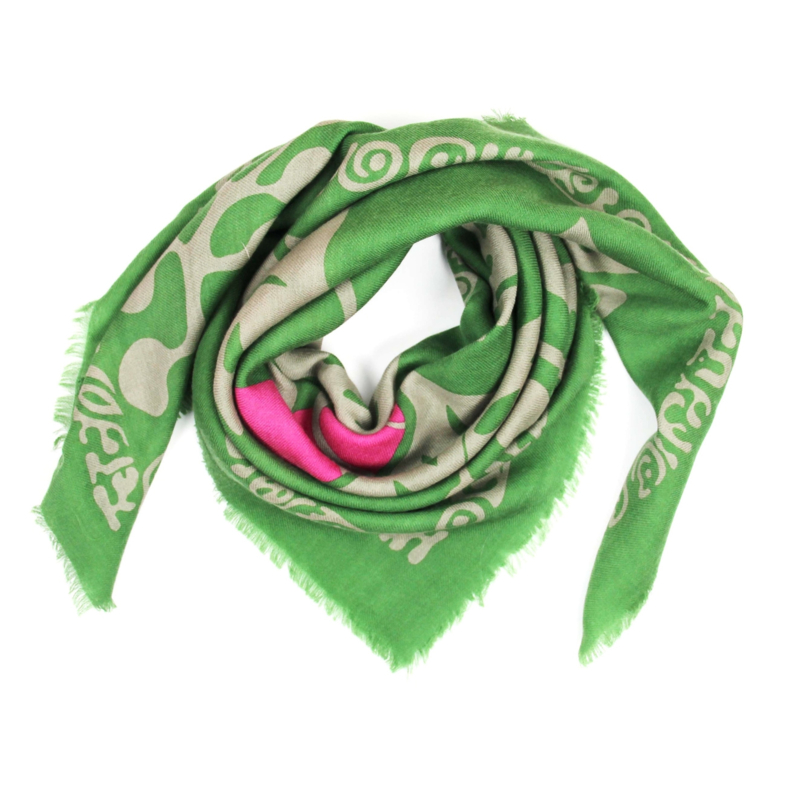 De Monstera sjaal in fris groen straalt pure energie uit. Het heldere bladgroen vormt de perfecte achtergrond voor de zachte beige-kleurige monstera-bladeren. Het verrassende fuchsia roze accent in de pot geeft de sjaal een speelse, eigentijdse twist.